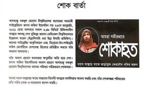 তার মৃত্যুতে গভীর শোক ও দুঃখ প্রকাশ করেছেন মকবুল হোসেন বিশ্ববিদ্যালয় কলেজের অধ্যক্ষ প্রফেসর আ ফ ম রেজাউল হাসান।